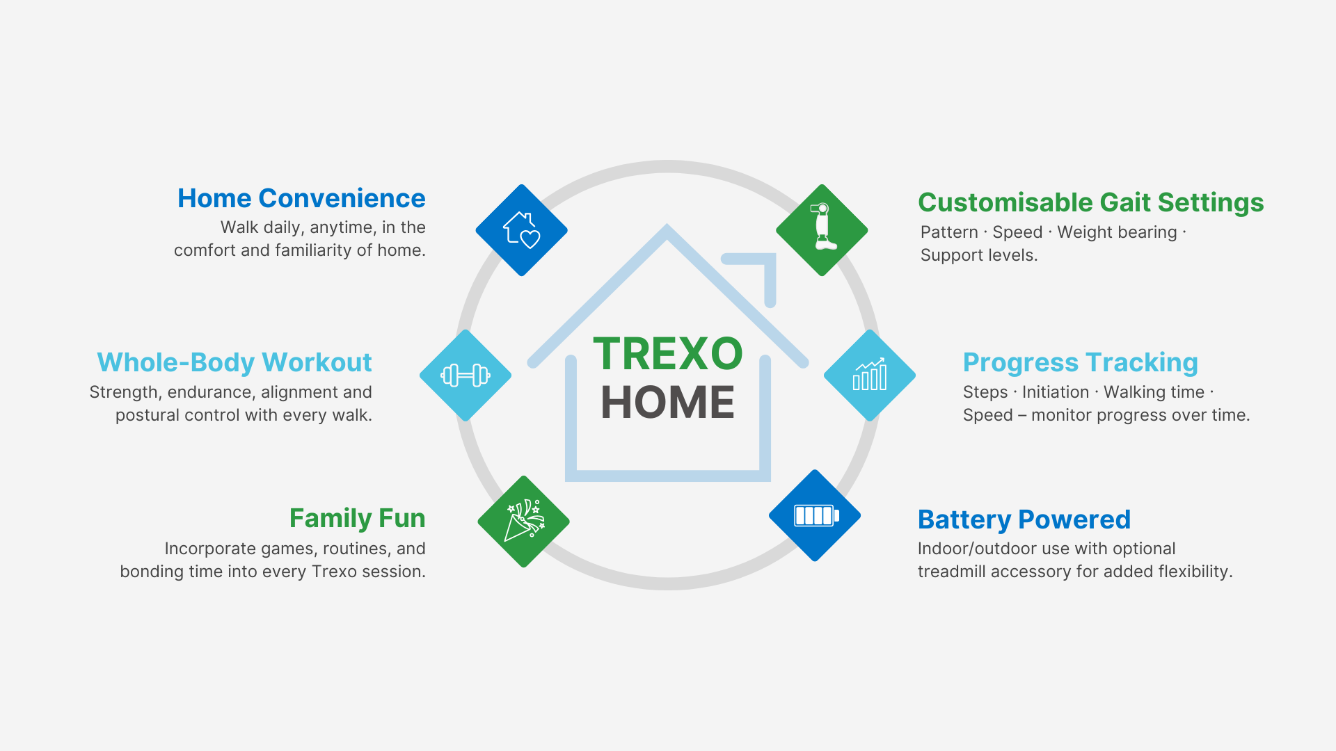 Each session helps build strength, endurance, alignment, and engagement - turning everyday moments into meaningful steps forward. Trexo Home empowers families to create new routines, celebrate new milestones, and reimagine what’s possible for their child’s future.