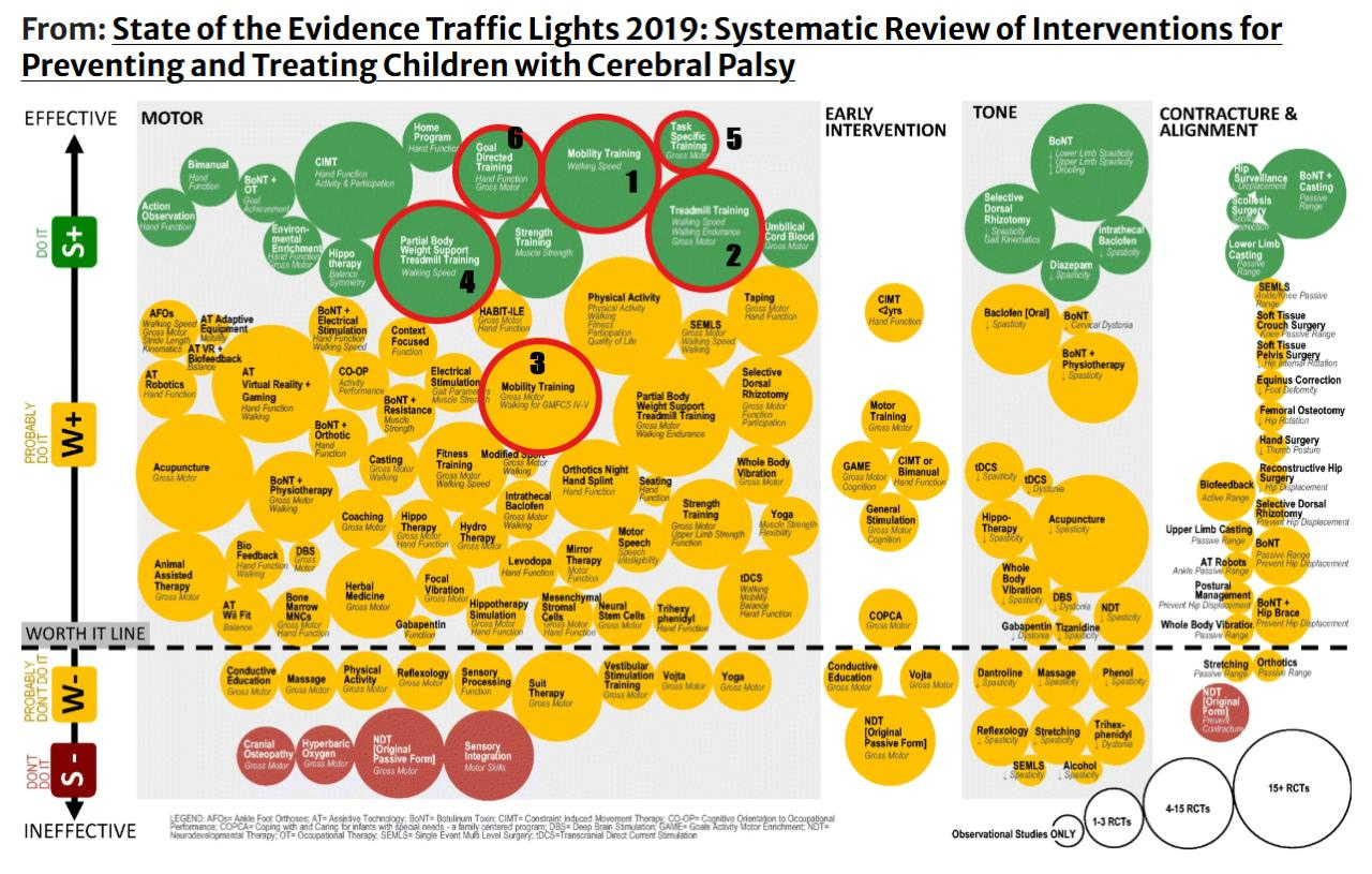 The State of the Evidence Traffic Lights 2019: Systematic Review of Interventions for Preventing and Treating Children with Cerebral Palsy provides one of the most comprehensive evaluations of therapies used to support children with cerebral palsy.