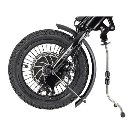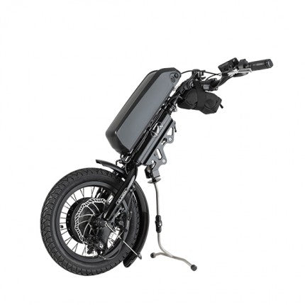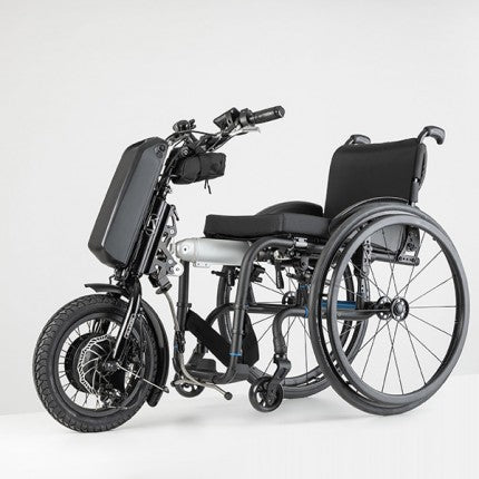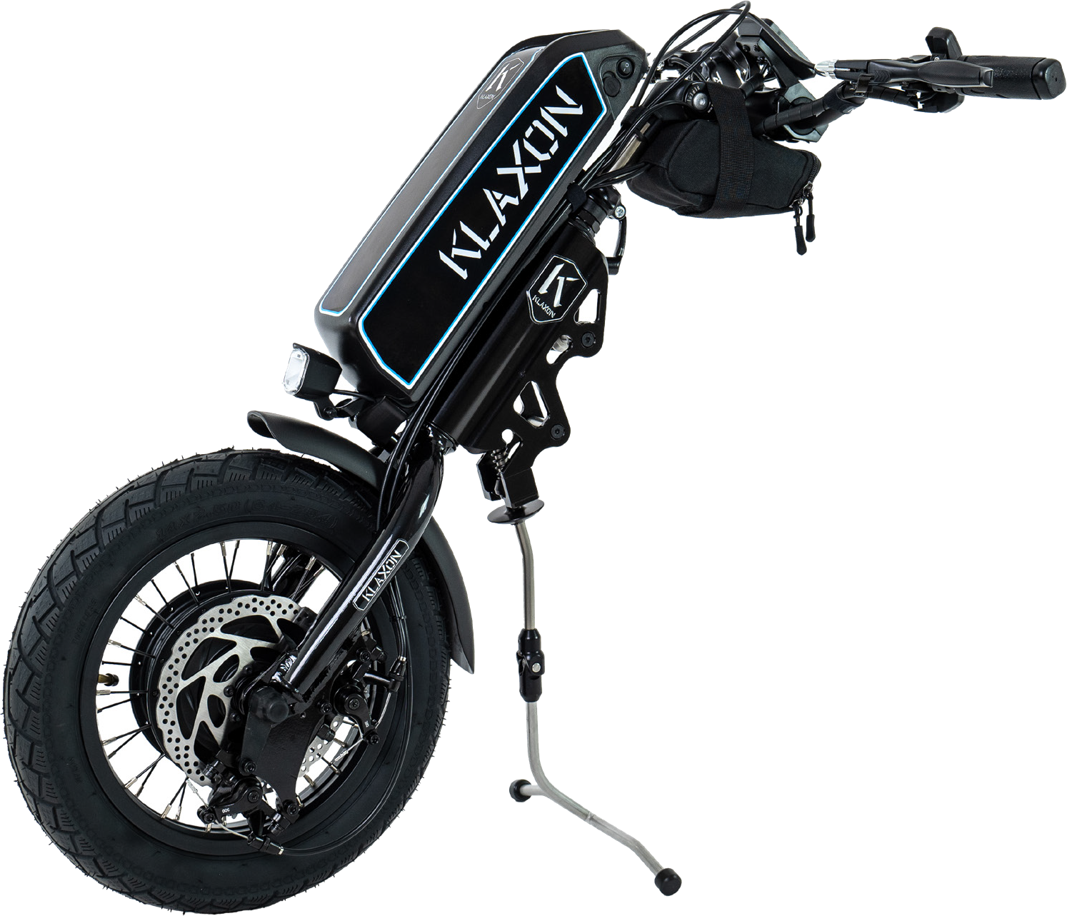 Klaxon Klick devices are small, light, compact and suitable for travel and everyday use. The Innovative Linking System Klaxon connects to any hand bike in the Klick range in seconds and the universal hub adapts to any fixed or folding wheelchair. The all-new Klick Standard Power features a distinctive Electronic Brake System. One touch of the brake lever is all it takes to stop, without having to use the mechanical brake. This new upgraded model also features a multi-function control panel with Adaptive Cruise Control to maintain your favourite speed; increased engine size with Boosted Power Capacity from 370W to 750W power, and a unique Mapping System which changes the way the engine handles power simply by changing from comfort for smooth acceleration and sport for a powerful and fast take off!